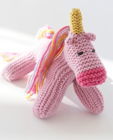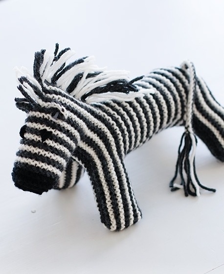 Hvis du gerne vil udfordres lidt mere i dit strikkearbejde, kan du overveje at strikke den flotte enhjørning, zebra eller løve. Udover at være strikket i retstrik, strikkes der her med omslag og udtagninger, og derudover skal over- og underdelen sys sammen.