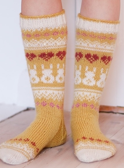 Vi tilbyder også opskrifter på flotte påskesokker. Disse kommer bl.a. i nordisk mønster og med harer og hjerter. Her kan du farvekoordinere sokkerne, præcis som du ønsker det. Og hvis ikke du selv står og mangler et par sokker, kender du med sikkerhed én, der ville elske at få et par i påskegave!