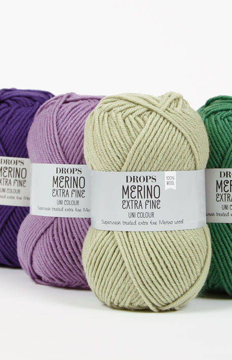 To af vores populære merinogarner er DROPS Baby Merino og DROPS Merino Extra Fine. Begge garner kan maskinvaskes, og derudover er de begge Oeko-Tex certificeret, hvilket betyder, at de er testet fri for skadelige kemikalier. Merino er også et naturfiber, som er yderst åndbart, hvilket betyder, at barnet kan komme af med sved og varme.