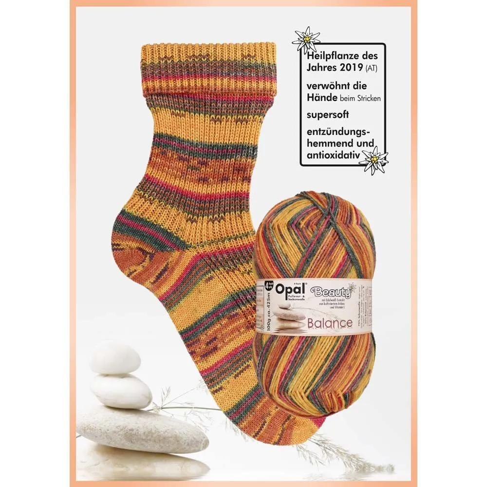 Opal Beauty Balance garn kombinerer traditionelle materialer med innovativ behandling. Dette flerfarvede garn består af 75% superwash virgin uld og 25% polyamid, forstærket med edelweiss ekstrakt og E-vitamin. Disse tilsætninger giver garnet antibakterielle og antioxidante egenskaber, hvilket gør det ideelt til både daglig brug og særlige projekter som strømper, trøjer, huer, vanter og tørklæder.
