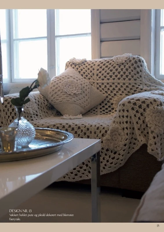 1 rute til teppet = 35 x 35 cm. 15 m glattstrikk med dobbelt garn og p 6 = 10 cm i bredden