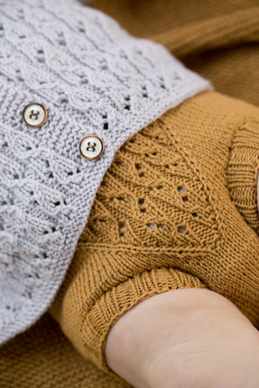 Hentesett strikket i Dale Lille Lerke. Størrelser 0-12 mdr.
