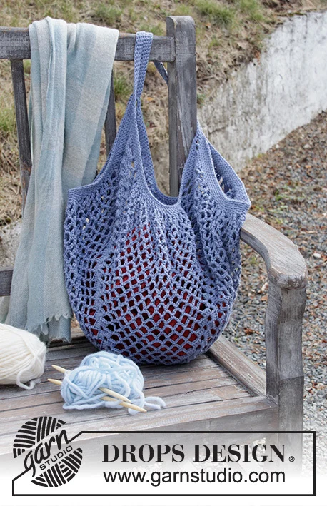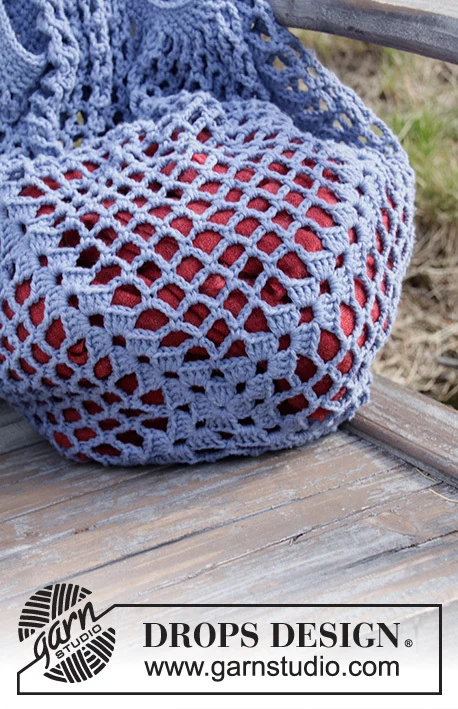 Hæklet net i DROPS Cotton Light. Arbejdet hækles rundt med luftmaskebuer og stangmaske-grupper.