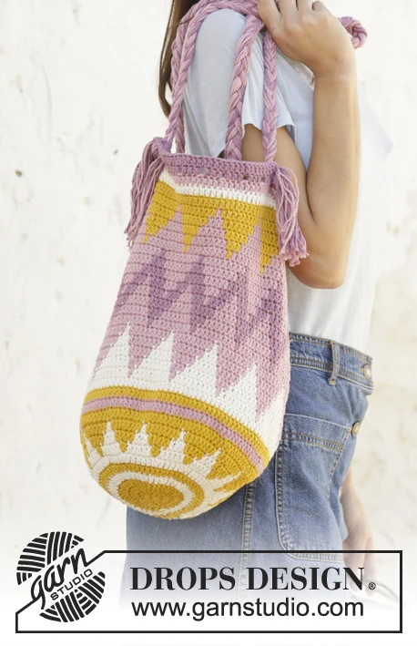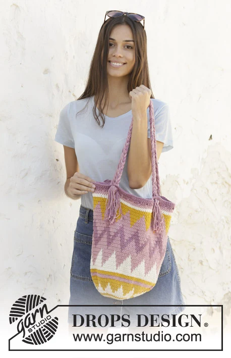 Hæklet taske med nordisk mønster i DROPS Paris. Arbejdet hækles fra bunden og op.