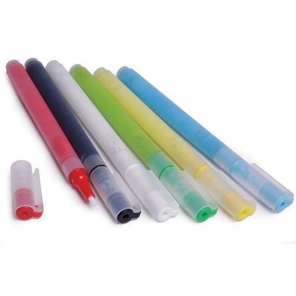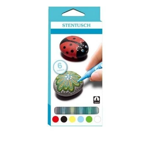 Pakken indeholder 6 tuscher i farverne: gul, grøn, blå, rød, sort og hvid.