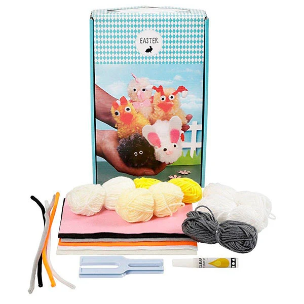 Materialesæt til 5 påskedyr af pomponer i akrylgarn med chenille, filt og Silk Clay.