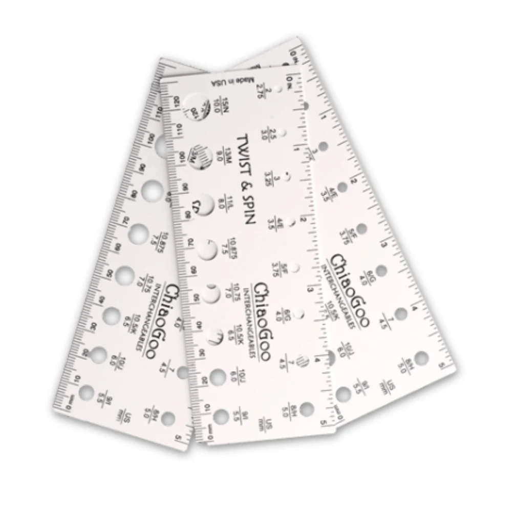 ChiaoGoo Pindemåler er et must-have værktøj for enhver strikker. Denne smarte kombination af lineal og pindemåler gør det nemt at holde styr på pindetykkelser og målinger, uanset hvor du arbejder. Lavet af let og slidstærkt plastik, er den både praktisk og nem at tage med.