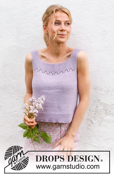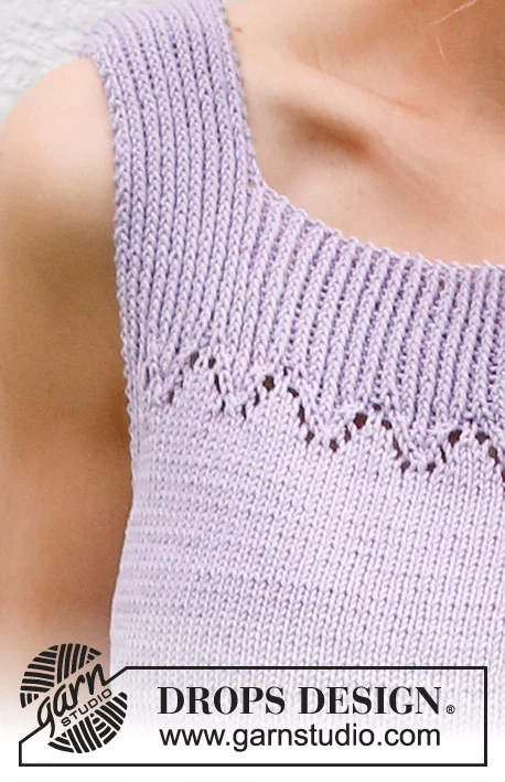 Strikket top / singlet i DROPS Safran. Arbejdet strikkes oppefra og ned med hulmønster og slids i siderne. Størrelse S - XXXL.