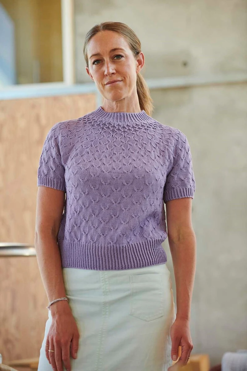 Skøn bluse med korte ærmer, et flot snit og et gennemgående mønster med stor effekt. Ved halsåbning, ærmekanter og den nederste kant er der strikket rib med drejet ret og vrang, hvilket giver en flot og markeret ribkant. Birdie Tee strikkes nedefra og op til ærmegabet. Derefter strikkes hvert ærme for sig, hvorefter arbejdet samles på en rundpind og færdiggøres med et rundt bærestykke. Til slut er der derfor meget lidt monteringsarbejde.